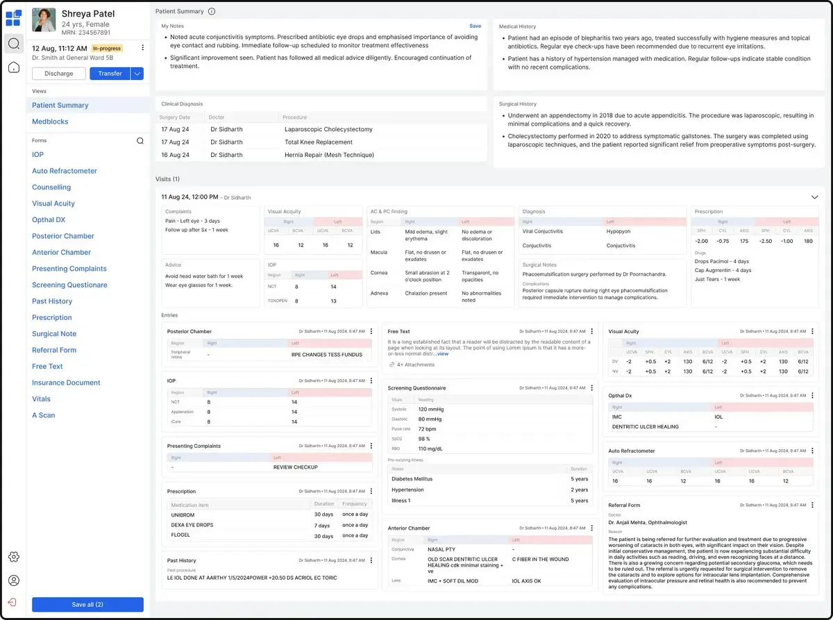 Here we leveraged Encounter and Form Level summaries from the Medblocks Platform that provides customizable options to display patient information - both from an encounter and long term. I worked on further customizing this to provide extensive information in a concise and scannable manner.